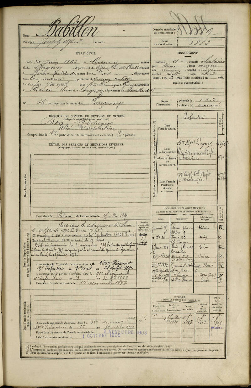 Joseph Alfred Babillon (1863 - ?) arrive à Paris aux alentours de 1886 et se marie à Louise Marie Hardouin le 18 juillet 1889 dans le 9e arrondissement. Joseph est alors garçon de salle puis limonadier par la suite. En 1895, il manque sa convocation au service militaire puis est déclaré insoumis en 1897. Il est arrêté par la gendarmerie le 25 décembre 1897 et est acquitté par le conseil de guerre. Il change plusieurs fois de domicile et passe son service militaire par obligation dans le 38e régiment d'infanterie le 14 octobre 1900. De lui nous n'avons plus de traces entre 1900 et 1931. Il est dit dans le recensement de 1931 qu'il est veuf et concierge à la Place des Deux-Écus. Nous ne lui connaissons pas de descendance à ce jour.