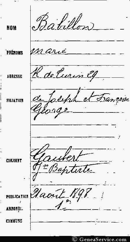 Marie Babillon (1866 - 1924) arrive à Paris en même temps que son frère et épouse Jean-Baptiste Marcel Gaubert le 1er septembre 1898 dans le 8e arrondissement. Marie est alors successivement cuisinière et ménagère et son mari est maitre d'hôtel. Il ont ensemble un fils, Georges Alfred Marcel Gaubert, né le 18 juillet 1899 dans le 18e arrondissement. Nous ne leur connaissons pas d'autre descendance à ce jour et ne savons rien de plus sur ce couple. Marie s'éteint le 11 août 1924 à son domicile au 33 rue de Clichy.